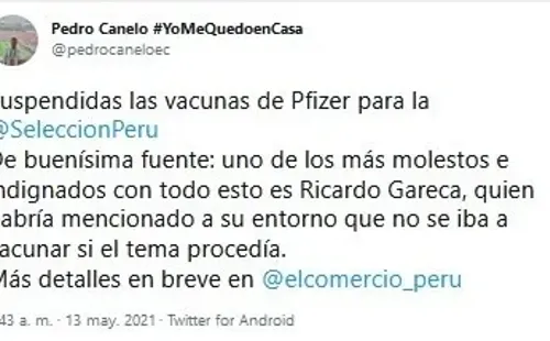 Un periodista del Comercio complementó información y habló del entrenador peruano, quien anteriormente se había manifestado con respecto a prioridades: “Suspendidas las vacunas de Pfizer para la Selección. De buenísima fuente: uno de los más molestos e indignados con todo esto es Ricardo Gareca, quien habría mencionado a su entorno que no se iba a vacunar si el tema procedía”.