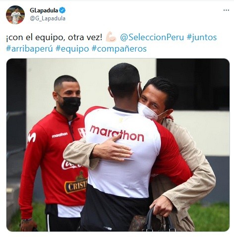De hecho, el propio Gianluca Lapadula lo compartió en sus redes. “¡Con el equipo, otra vez!”, escribió taggeando a la Selección Peruana y con los siguientes hashtags #juntos #arribaperú #equipo #compañeros.