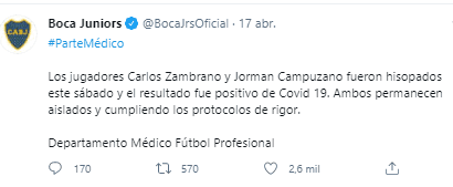 Cabe señalar que el pasado 17 de abril, Carlos Zambrano fue notificado como positivo a COVID-19 tras someterse a las pruebas. En ese momento Boca Juniors sostuvo lo siguiente: “Los jugadores Carlos Zambrano y Jorman Campuzano fueron hisopados este sábado y el resultado fue positivo de COVID-19. Ambos permanecen aislados y cumpliendo los protocolos de rigor”. El tiempo de recuperación fue bastante rápido al parecer, buenas noticias para la Selección Peruana y Boca Juniors con seguridad.