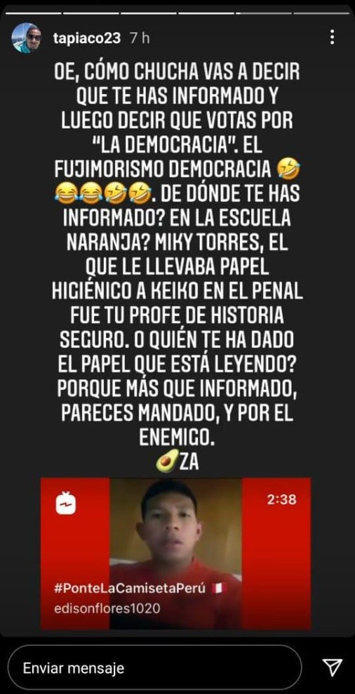 “Oe, cómo chuchas vas a decir que te has informado y luego decir que votas por “la democracia”. ¿El fujimorismo democracia, de dónde te has informado? ¿En la escuela naranja? Miki Torres, el que le llevaba papel higiénico a Keiko en el penal fue tu profe de historia seguro. ¿O quién te ha dado el papel que estás leyendo? Porque más que informado, pareces mandado, y por el enemigo. Paltaza”.