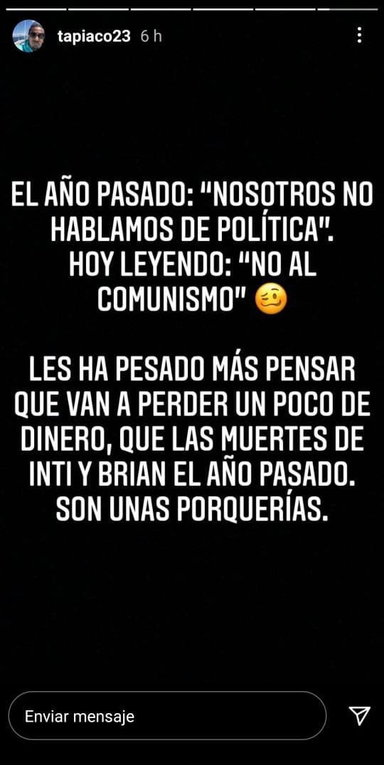 Continuando el hermano de Renato Tapia con algunas frases más de alto calibre: “El año pasado: “Nosotros no hablamos de política”. Hoy leyendo: “No al comunismo”. Les ha pesado más pensar que van a perder un poco de dinero, que las muertes de Inti y Bryan el año pasado. Son unas porquerías”. Material altamente polémico.