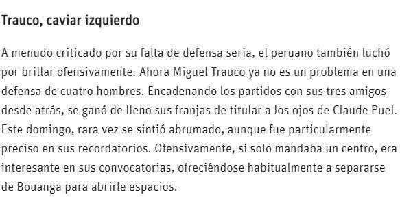 “Trauco, caviar izquierdo. A menudo criticado por su falta de defensa seria, el peruano también luchó por brillar ofensivamente. Ahora Miguel Trauco ya no es un problema en una defensa de cuatro hombres. Encadenando los partidos con sus tres amigos desde atrás, se ganó de lleno sus franjas de titular a los ojos de Claude Puel. Este domingo, rara vez se sintió abrumado, aunque fue particularmente preciso en sus recordatorios. Ofensivamente, si solo mandaba un centro, era interesante en sus convocatorias, ofreciéndose habitualmente a separarse de Bouanga para abrirle espacios”.