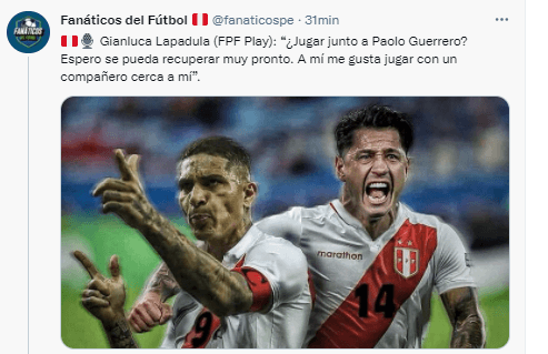 “Espero que pueda volver muy pronto. Como lo he dicho antes, me gusta jugar con un compañero cerca a mí. Eso no es un problema. Espero conocerlo y también a Jefferson Farfán, que espero que se recupere muy pronto”. Sostuvo Lapadula en charla exclusiva con la aplicación de comunicación digital de la ‘FPF’.