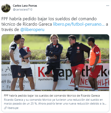 Según reveló el comentarista deportivo, Óscar del Portal, en DIRECTV Perú: “la FPF le ha pedido al CT de la Selección bajarle el sueldo los próximos meses”. Esto con motivo de una crisis económica en la ‘Federación Peruana de Fútbol’, tras los últimos hechos mundiales que se están viviendo en nuestra sociedad.