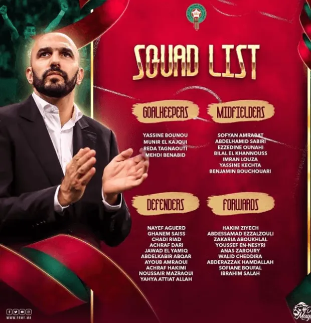 Entre los llamados por Walid Regragui están sus figuras como: Yassine Bounou, arquero pertenece a las filas del Sevilla, así como Achraf Hakimi del PSG, Sofiane Boufal, Sofyan Amrabat, Azzedine Ounahi, la novedad es el juvenil del Barcelona, Chadi Riad. Entre otros elementos que los ayudaron a lograr hacer historia en el Mundial de Qatar 2022.