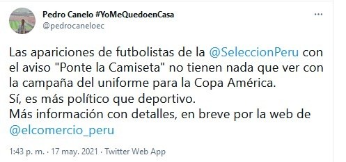 Según un periodista del Comercio como Pedro Canelo, efectivamente hay trasfondo electoral: “Las apariciones de futbolistas de la Seleccion con el aviso “Ponte la Camiseta” no tienen nada que ver con la campaña del uniforme para la Copa América. Sí, es más político que deportivo”.