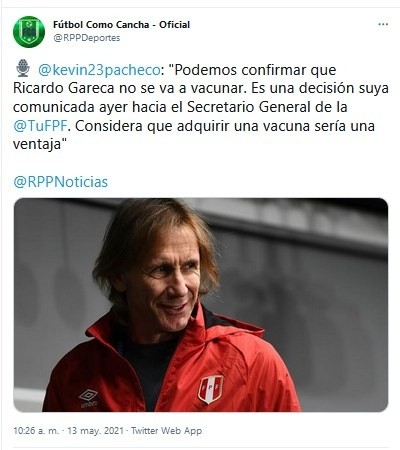 Según Kevin Pacheco, también de RPP, el Tigre no quería ser parte de la injusticia: “Podemos confirmar que Ricardo Gareca no se va a vacunar. Es una decisión suya comunicada ayer hacia el Secretario General de la FPF. Considera que adquirir una vacuna sería una ventaja”.