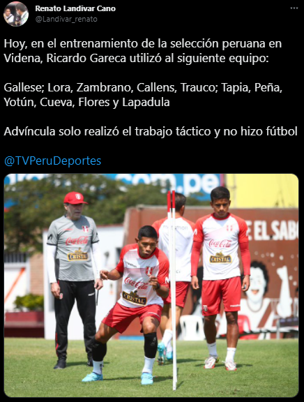 Quien reveló en su cuenta de Twitter un par de sorpresas interesantes de analizar: “Hoy, en el entrenamiento de la selección peruana en Videna, Ricardo Gareca utilizó al siguiente equipo”. Pasando a contar líneas después, cómo estaría parando si mañana fuese el enfrentamiento.