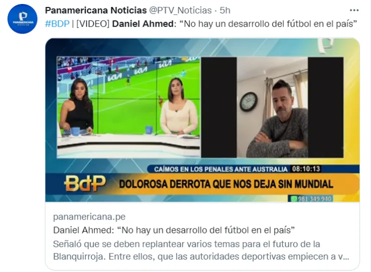 Daniel Ahmed, exjefe de la Unidad técnica de menores de la Federación Peruana de Fútbol,y ex DTde Alianza Lima, habló sobre el gran problema que atraviesa hoy en día el fútbol peruano y, también habló de lo que significó la derrota de la Selección Peruana a manos de Australia en el repechaje intercontinental.