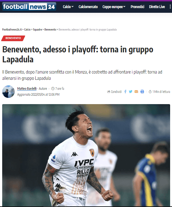 Vamos al plano netamente informativo, donde conoceremos la realidad que viven quienes tienen a ‘El Chasqui’ parado desde que jugó por última vez con Perú: “El Benevento ha apagado definitivamente las esperanzas de llegar a la Serie A sin pasar por los playoffs, tras la amarga derrota ante el Monza. Ahora llega el turno de los play-offs y habrá otro mini torneo al que enfrentarse”.