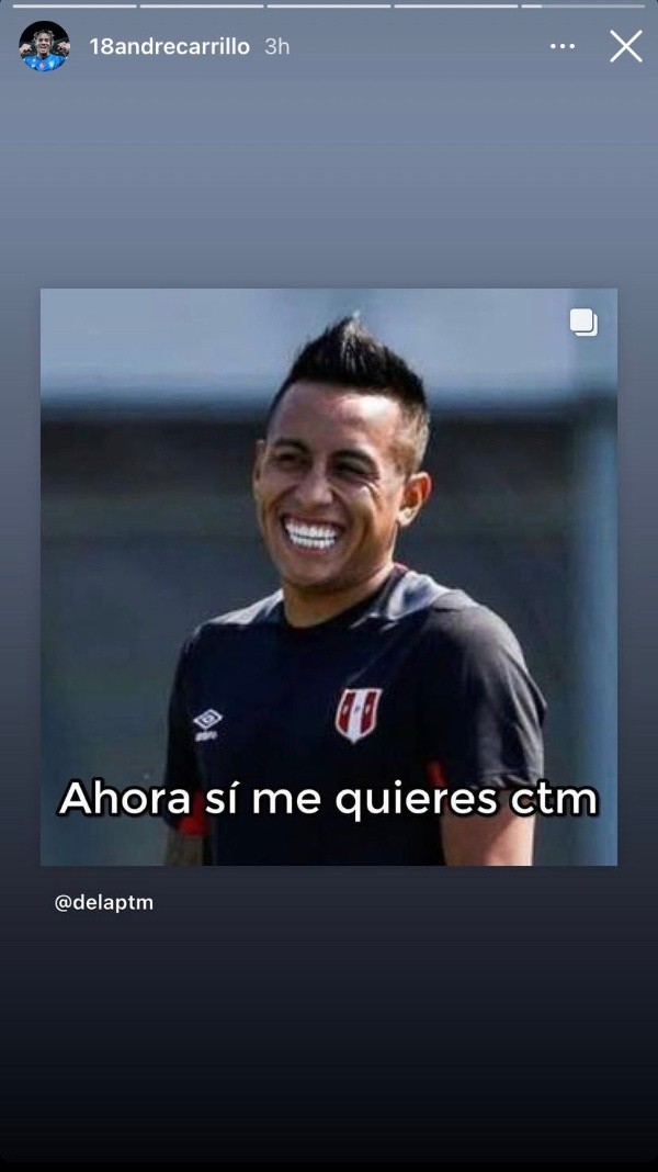 Muchos entonces se acordaron de los habituales insultos que recibía el jugador por los penales fallados. Su propio compañero, André Carrillo, lo hizo pero con una muestra de apoyo. Compartió un meme con una foto del jugador que decía: “Ahora sí me quieres CTM”.