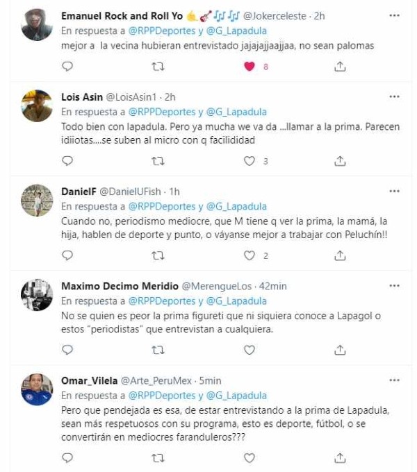 Algunos medios, sin embargo, han ido demasiado lejos. Este jueves, por ejemplo, después del debut en el marcador de Gianluca Lapadula, en Fútbol como Cancha de RPP entrevistaron a la prima del jugador del Benevento.