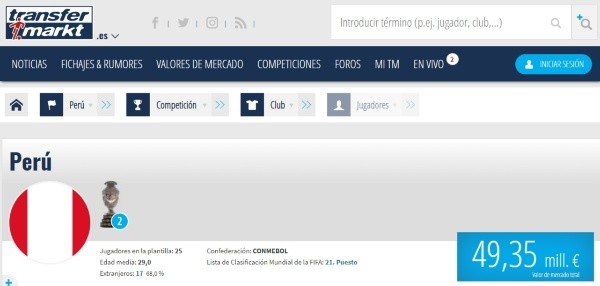 La Selección Peruana, para la página Transfermarkt, está tasada en 49, 35 millones de euros. La cifra, que se da tras reunir a todo el valor del plantel, es aportada, en gran parte, por el precio que tiene el delantero Gianluca Lapadula.