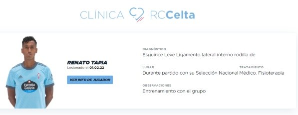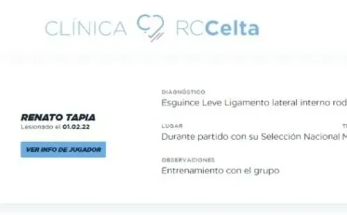 El volante del Celta salió del terreno de juego en los últimos minutos del encuentro, debido a una lesión, la cual lo dejó tendido sobre el gramado. El Celta de Vigo publicó, en su cuenta de Twitter, el parte médico del futbolista donde dice: “Renato Tapia sufre un esguince leve en el ligamento lateral interno de su rodilla derecha. Este viernes entrenó con el grupo”, informaron desde España.