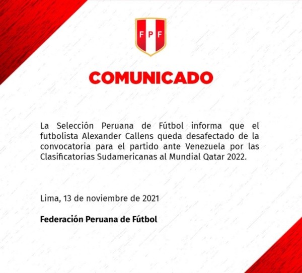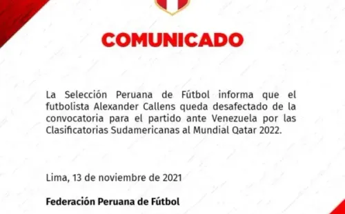 En el partido frente a Bolivia, donde Perú ganó por 3-0 en un partido que dominó, el defensor central Alexander Callens no regresaría al campo en la segunda mitad del cotejo, en su reemplazo ingresaría Luis Abram. El jugador del New York City habría llegado a Lima con una fatiga pero de todas formas fue desde el arranque frente a los del altiplano.