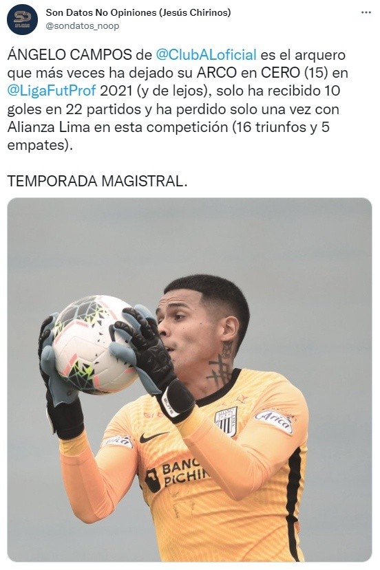Si nos basamos fríamente en los números, Ángelo Campos ha sido el mejor portero de la temporada 2021 de la Liga 1. Dejando su arco en 15 partidos, solo recibió 10 goles en 22 encuentros y, para hacer más increíble la estadística, solo perdió una vez con Alianza Lima en la Liga 1: 16 triunfos y 5 empates.