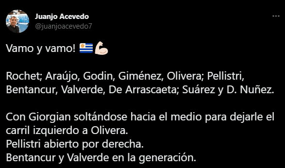 El conjunto ‘celeste’ según la información del periodista local Juanjo Acevedo, del programa deportivo ‘Tirando Paredes’, confirmó como jugará su combinado patrio en Twitter con este titular: “Vamo y vamo!”. Para después explicar cómo formará desde un comienzo el cuadro que hace de local en el ‘Estadio Centenario de Montevideo’.