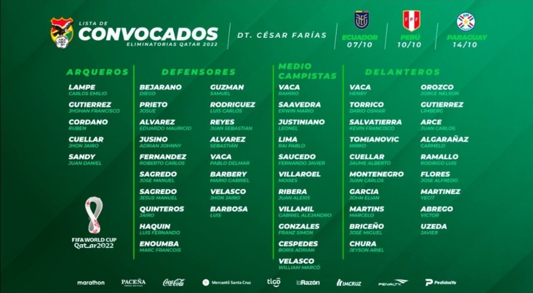 La selección boliviana anunció sus convocados, a través de sus redes sociales, para esta fecha triple de Eliminatorias, donde uno de sus rivales será la ‘blanquirroja’. También tendrá como rivales a Ecuador y Paraguay, los dirigidos por el técnicoCésar Farías buscan el milagro para poder clasificar al Mundial de Qatar 2022.
