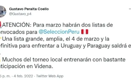 El periodista Gustavo Peralta publicó información sobre la Selección Peruana en su cuenta de Twitter donde pone: “ATENCIÓN: Para marzo habrá dos listas de convocados para la Selección Peruana. Una lista grande, amplia, el 4 de marzo y la definitiva para enfrentar a Uruguay y Paraguay saldrá el 11”, informó el reportero de ESPN.