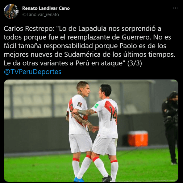 “Lo de Lapadula nos sorprendió a todos porque fue el reemplazante de Guerrero. No es fácil tamaña responsabilidad porque Paolo es de los mejores nueves de Sudamérica de los últimos tiempos. Le da otras variantes a Perú en ataque”. Fue lo que mencionó Restrepo sobre Gianluca Lapadula.