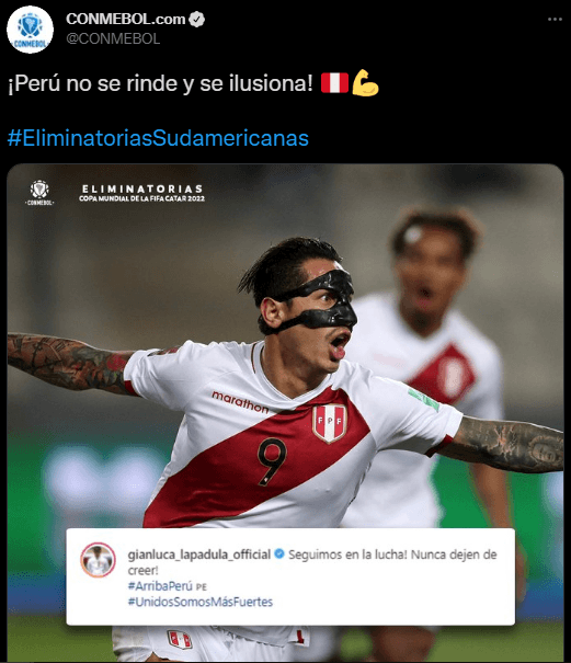 Utilizando la fotografía de Gianluca Lapadula, el ente rector de Sudamérica animó y motivó a todos los peruanos a pensar en que la clasificación al Mundial de Qatar 2022, todavía es posible. Gracias al triunfo categórico de local frente a la ‘Amenaza Verde’ este último jueves 11.