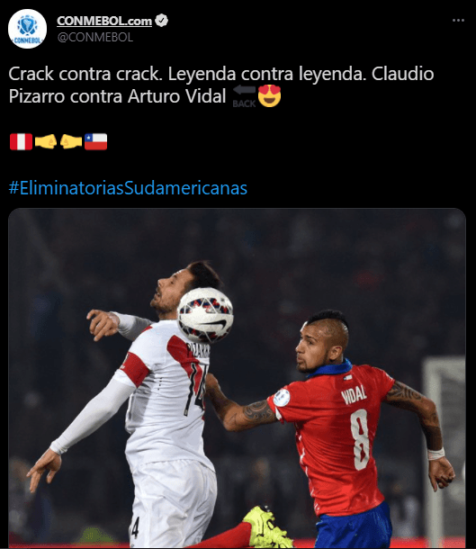CONMEBOL en sus redes sociales dejó como pie de fotografía la siguiente reseña: “Crack contra crack. Leyenda contra leyenda. Claudio Pizarro contra Arturo Vidal”. Haciendo clara alusión a la previa entre Perú y Chile, a jugarse este jueves por la noche, en el Estadio Nacional de Lima.