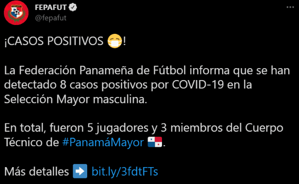 “¡CASOS POSITIVOS! La Federación Panameña de Fútbol informa que se han detectado 8 casos positivos por COVID-19 en la Selección Mayor masculina. En total, fueron 5 jugadores y 3 miembros del Cuerpo Técnico de #PanamáMayor”. Sin esconder absolutamente, exclarecen todo.