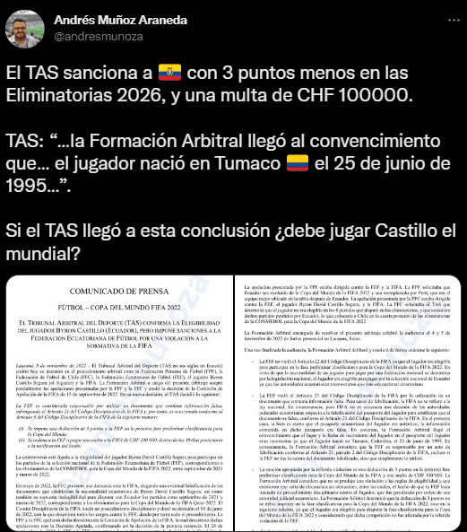 El periodista deportivo ecuatoriano, Andrés Muñoz Araneda, mencionó en su cuenta de Twitter el detalle de lo que es la sanción en contra de su Federación. Todo lo que se conoce desde hace algunas horas, es resumido de la siguiente manera por el comunicador social: “El TAS sanciona a Ecuador con 3 puntos menos en las Eliminatorias 2026, y una multa de CHF 100000”.