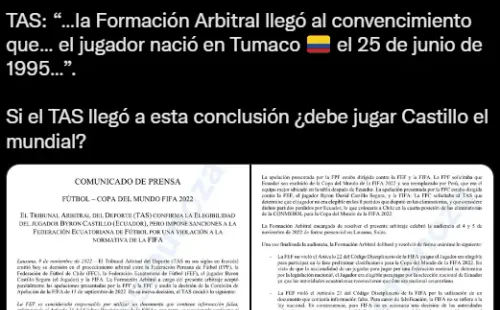 Dejando una pregunta abierta, generando una interacción convertida en viral, casi inmediata: “Si el TAS llegó a esta conclusión, ¿debe jugar Castillo el mundial?”. Los hermanos ecuatorianos están solicitando que mientras no haya una voz oficial desde la Federación de Fútbol, el jugador no sea considerado para evitar algún problema futuro. Demostrando de forma indirecta, que Perú tuvo razón en su reclamo, pero no se llevó ningún punto a favor.