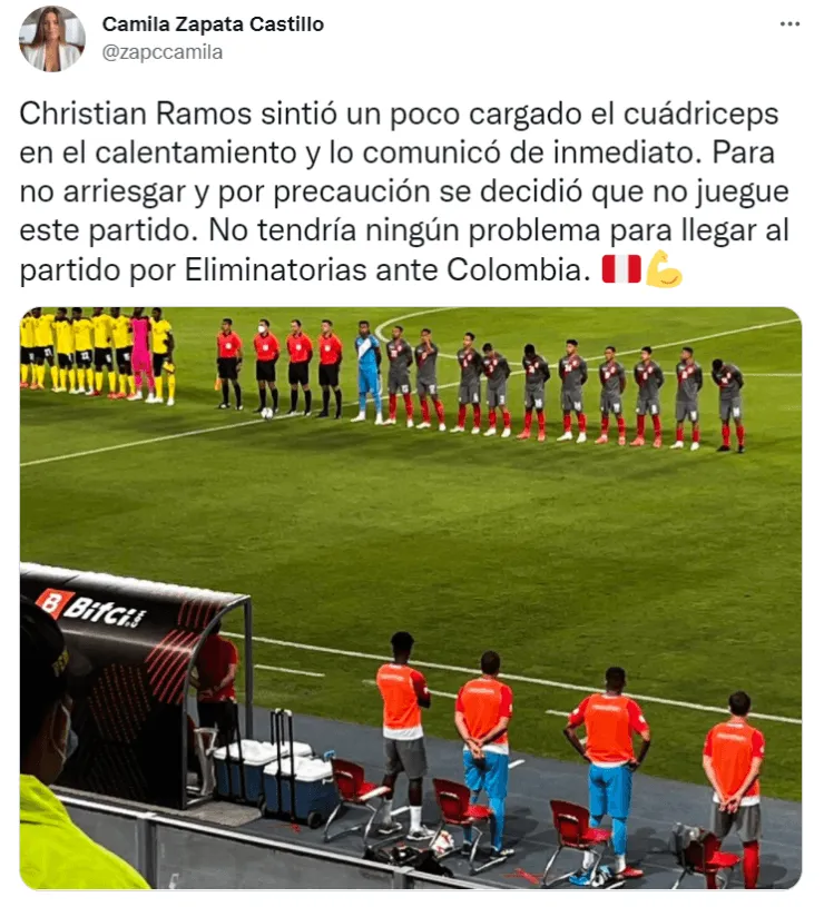 “Christian Ramos sintió un poco cargado el cuádriceps en el calentamiento y lo comunicó de inmediato. Para no arriesgar y por precaución se decidió que no juegue este partido. No tendría ningún problema para llegar al partido por Eliminatorias ante Colombia”, reveló Camila Zapata sobre la situación de la ‘Sombra’.