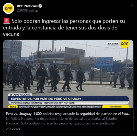 Además, La PNP confirmó que las restricciones para este encuentro por ‘FECHA FIFA’ se iniciaron a partir del mediodía en las zonas colindantes, perímetro y parte interna del estadio, en tanto que las puertas del recinto se abrieron desde las 4 de la tarde.