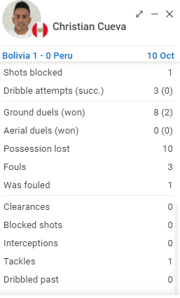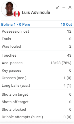 Vamos desde atrás hacia adelante. El primero por posición es Luis Advíncula, según esta web internacional, el lateral derecho de Boca Juniors ante Bolivia perdió 12 balones. Yoshimar Yotún perdió 12 balones. Y Christian Cueva, el tan criticado futbolista de ayer, perdió 10 balones. Casualidad o no, pero según los números hubo una constante que nos hundió.