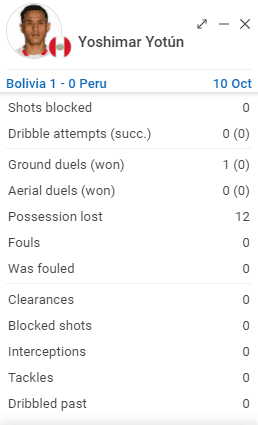 En este caso vamos a los aspectos estadísticos, donde podremos entender otros detalles aún no referenciados. Según SOFASCORE, la aplicación de estadística deportiva conocida mundialmente, un factor para comprender la derrota de Perú ante el combinado boliviano es el siguiente.