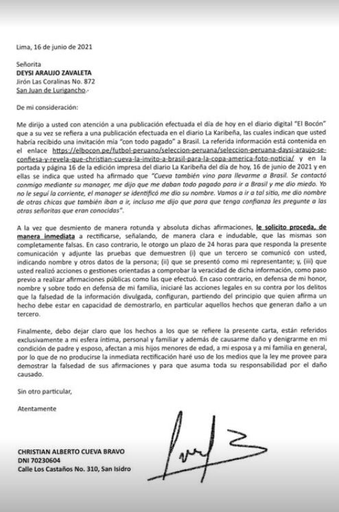 “Los hechos a los que se refiere la presente carta, están referidos exclusivamente a mi esfera íntima, personal y familiar, y además de causarme daño y denigrarme en mi condición de padre y esposo, afectan a mis hijos menores de edad, a mi esposa y a mi familia en general”, agregó Christian Cueva en su carta notarial.