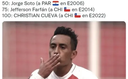 También indica que el gol 25 lo hizo Jorge Soto frente a Paraguay en las Eliminatorias de 1994, seguido nuevamente por el ‘Camello’, que esta vez anotó el tanto 50 frente a la misma selección en el 2006. Del número 75 se encargó Jefferson Farfán frente a ‘La Roja’ en el 2014 y ahora Christian Cueva contra el mismo cuadro que marcó ‘La Foquita’ para dejar en la historia la anotación 100.