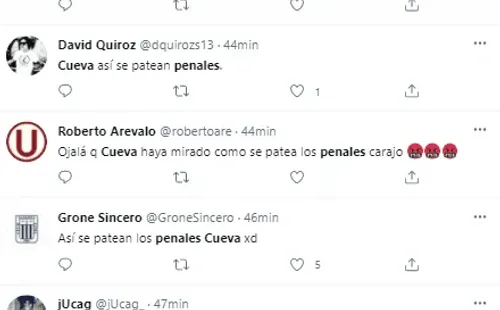 Los mensajes van desde bromas, hasta faltas de respeto contra el volante del Al-Fateh de Arabia Saudita. Preguntándose si ‘Christian Cueva está viendo la ronda de penales’, esperando que ‘Aladino’ haya estado viendo esta ronda y aprenda a definir. Todo porque el enganche peruano, falló el trágico lanzamiento desde los 12 pasos ante Dinamarca en el mundial de Rusia 2018.