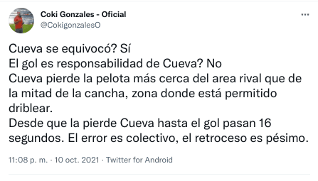 “¿Cueva se equivocó? Sí ¿El gol es responsabilidad de Cueva? No. Cueva pierde la pelota más cerca del area rival que de la mitad de la cancha, zona donde está permitido driblear. Desde que la pierde Cueva hasta el gol pasan 16 segundos. El error es colectivo, el retroceso es pésimo”, escribió el mencionado comunicador en su twitter ¡Clarito!