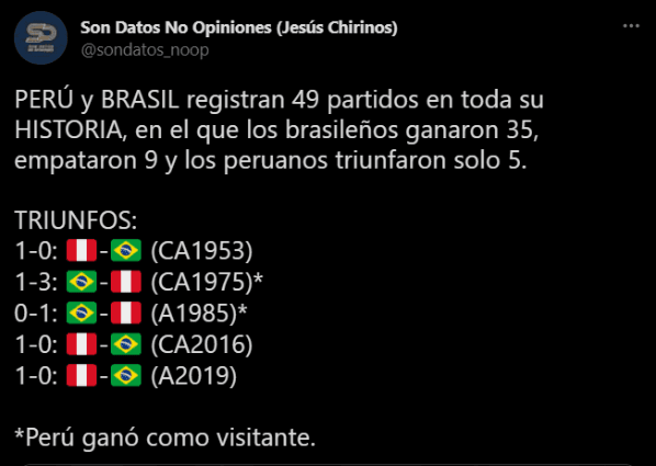 Los triunfos de Perú como bien lo señala fueron en 5 oportunidades: 1-0 (Copa América 1953). 1-3 (Copa América 1975). 0-1 (Amistoso 1985). 1-0: (Copa América 2016). Y 1-0: (Amistoso 2019). En 1975 y 1985 ganamos como visitantes. Los números son fríos, está complicado, pero lo último que se pierde es la fe.