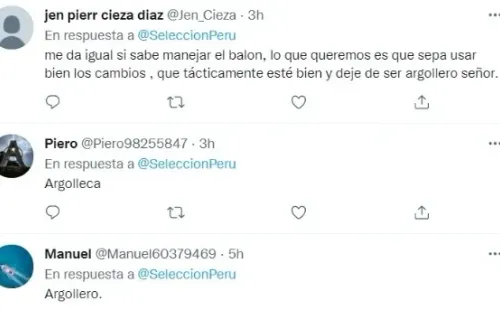 Tras la imagen, publicada en el Twitter de la Selección Peruana, de Ricardo Gareca haciendo jueguitos con el balón, los hinchas calificaron como ‘argollero’ a el ‘Tigre’ poniendo: “Me da igual si sabe manejar el balón, lo que queremos es que sepa usar bien los cambios, que tácticamente esté bien y deje de ser argollero señor”, “Argolleca”, “Que los haga practicar tiros al arco para que hagan goles y no pierdan penales porque Solano no produce”, comentaron algunas personas.