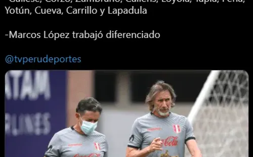 “Hoy, en la práctica de la selección peruana en Videna, el técnico Ricardo Gareca trabajó con el siguiente equipo: Gallese; Corzo, Zambrano, Callens, Loyola; Tapia, Peña, Yotún, Cueva, Carrillo y Lapadula”. Lo revela el periodista de TVPERU DEPORTES, Renato Landívar, quien una vez más adelantó información relevante.