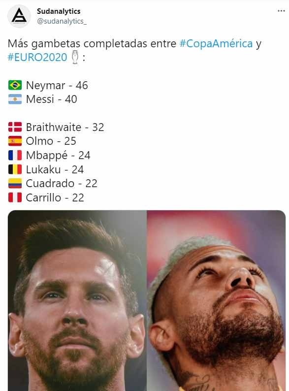 “Más gambetas completadas entre Copa América y EURO2020: Neymar (46) Messi (40) Braithwaite (32) Olmo (25) Mbappé (24) Lukaku (24) Cuadrado (22) Carrillo (22)”, colocaron en un tweet al nacional con pura figura internacional ¡Excelente Culebra!