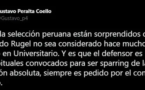 El periodista del ‘Diario Líbero’, Gustavo Peralta, explicó un dato corroborado: “Desde la Selección Peruana están sorprendidos con que Leonardo Rugel no sea considerado hace mucho tiempo en Universitario. Y es que el defensor es uno de los habituales convocados para ser sparring de la selección absoluta, siempre es pedido por el comando técnico”.