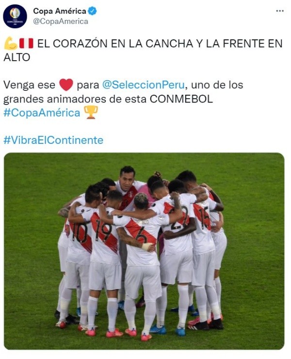 La Copa América realizó una publicación en sus redes sociales con referencia a Perú. La organización publicó: “el corazón en la cancha y la frente en alto”. Y también indicando que es uno de los grandes animadores de la Copa América 2021. Sin duda alguna el plantel dirigido por Ricardo Gareca ha ido de menos a más en este torneo y ha dejado nombres para lo que sigue en el proceso del ‘Tigre’.