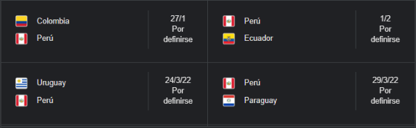 Donde estará afrontando las primeras fechas dobles entre enero y febrero. Primero como visitante ante Colombia, y después para recibir en el Estadio Nacional a Ecuador. Pasando luego a la fase final, donde definiremos si vamos o no a la competencia mundial organizada por la FIFA.