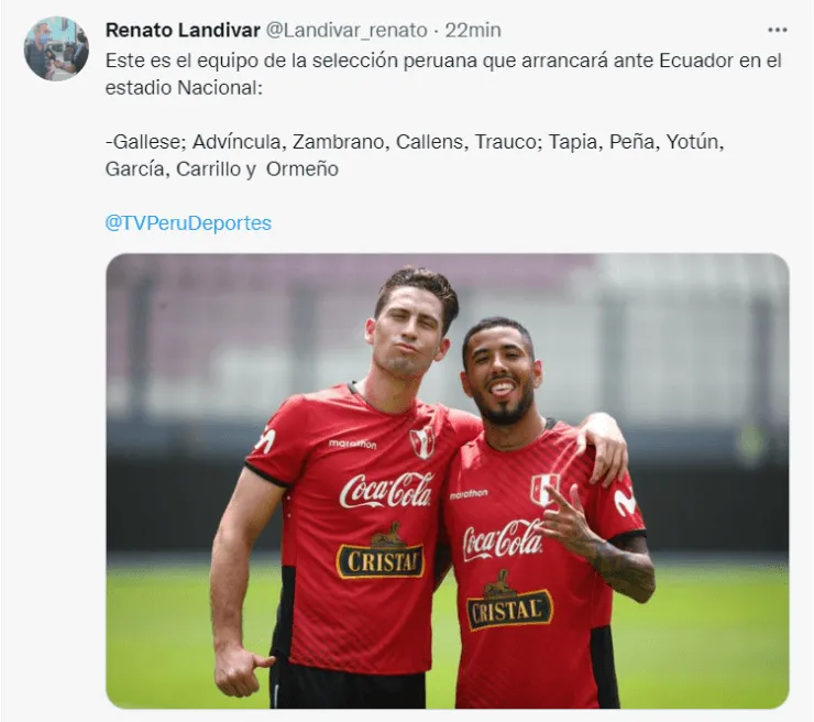 LaSelección Peruanaconfirmó su once inicial para enfrentar esta noche a Ecuadoren Lima,donde buscará sumar otros tres puntos para seguir en la cuarta posición delasEliminatorias Sudamericanasrumbo aQatar 2022. Cabe resaltar que con la victoria parcial de Uruguay sobre Venezuela (3-0) en estos momentosPerú es quinto con 20puntos, y esta a dos unidades del conjunto ‘charrúa’ y a cuatro del seleccionado ecuatoriano.