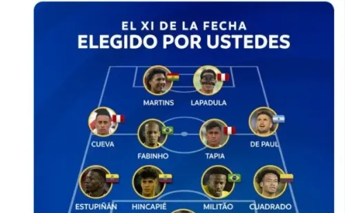 La Selección Peruana tuvo puntos fuertes dentro del campo, por ese motivo es que la Conmebol en su cuenta de Instagram publicó este jueves 18 de noviembre el equipo ideal, donde votaron los hinchas, en donde figuran 4 peruanos. En el arco Pedro Gallese, de volantes Renato Tapia y Christian Cueva y en la delantera Gianluca Lapadula.