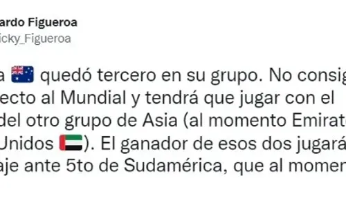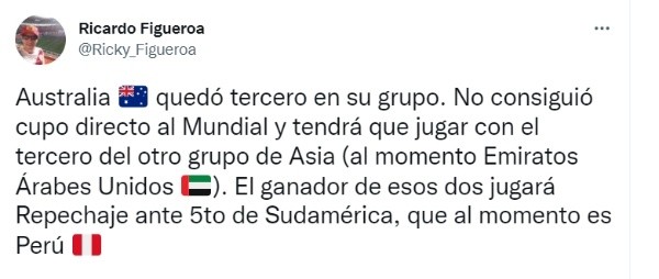Si la Selección Peruana logra vencer a Paraguay en el estadio Nacional de Lima, obtendría una esperanza más para clasificar al Mundial de Qatar 2022 jugando el repechaje. Este encuentro será de un solo partido en un campo neutral. El periodista Ricardo Figueroa publicó en sus redes sociales sobre el posible rival del combinado Sudamericano que logre llegar a la repesca: “Australia quedó tercero en su grupo. No consiguió cupo directo al Mundial y tendrá que jugar con el tercero del otro grupo de Asia (Al momento Emirato Árabes Unidos). Elganador de esos dos jugará Repechaje ante 5to de Sudamérica, que al momento es Perú”, sostuvo.