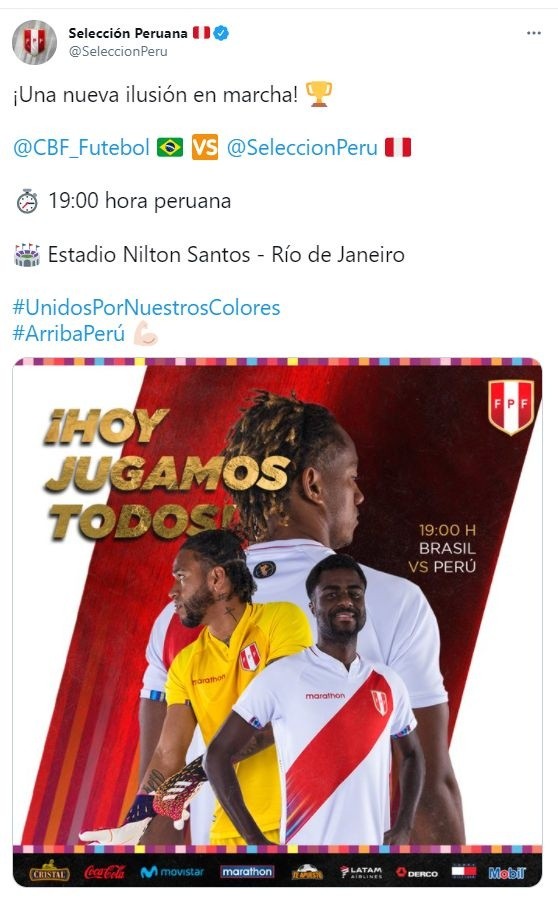En esta oportunidad, el equipo del estratega argentino Ricardo Gareca disputará su primer partido frente a la ‘Canarinha’. En esa línea, el volante expresó, mediante sus redes sociales, todo su apoyo a la Selección Peruana con referencia al partido de este jueves: “Hoy todos somos Perú. Vamos Perú”, agregó el jugador de 30 años.