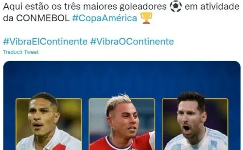 “IMPARABLES. Aquí están los tres máximos goleadores en actividad de la CONMEBOL Copa América”, publicaron los organizadores, donde colocan una imagen de Paolo Guerrero, Eduardo Vargas y Lionel Messi en sus redes sociales oficiales. El chileno pudo alcanzar al goleador de la Selección Peruana, tras anotar 2 tantos.
