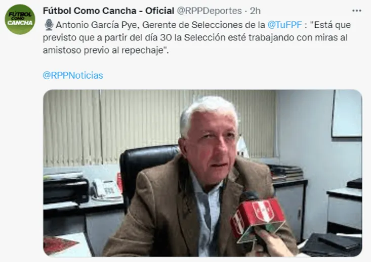 “Estáprevisto que a partir del día 30 de mayo,la Selección Peruana esté trabajando en Videna, con miras al partido amistoso previo al repechaje”, reveló este viernes García Pye en una entrevista del programa’Fútbol Como Cancha’de RPP Noticias.